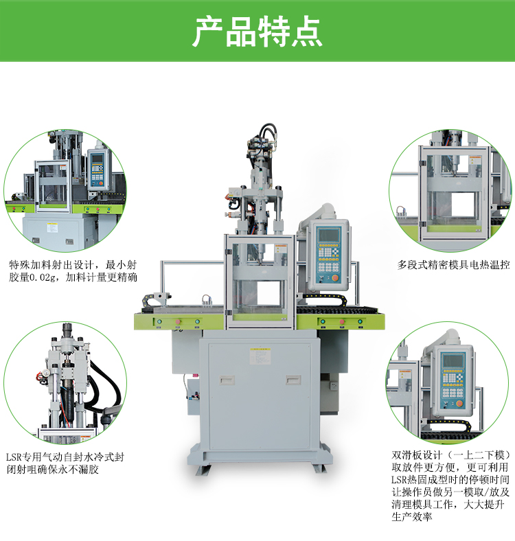特出添加了奇奇怪怪射得制作,最長射膠量0.02g,添加了奇奇怪怪測量更準確度。  多段式精細硅膠模具電暖恒溫。  LSR使用氣動式自封水冷器式開敞射咀加強組織領導從不漏膠。  雙雙翹板設汁(一上二模)取放件更不便,更可充分利用LSR熱固成型模樣時的停頓時,讓的操作工做別的模取/放及保養沖壓模具工做,有很大程度的不斷提升的生產速度。